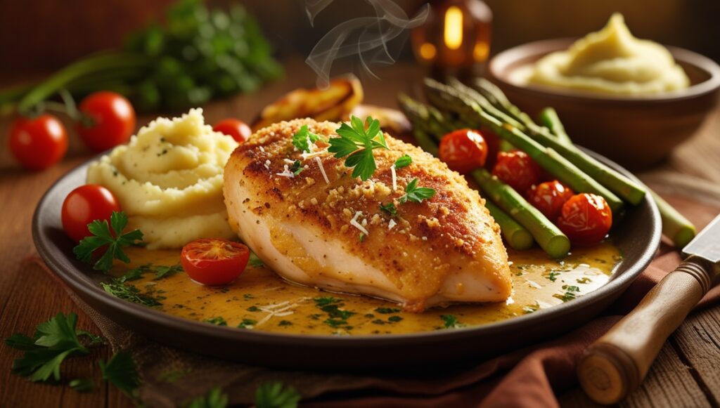 The dish is a blend of simple ingredients and expert preparation. Your taste buds will love the sophisticated yet approachable flavors. It’s a garlic crusted chicken breast that everyone loves.
